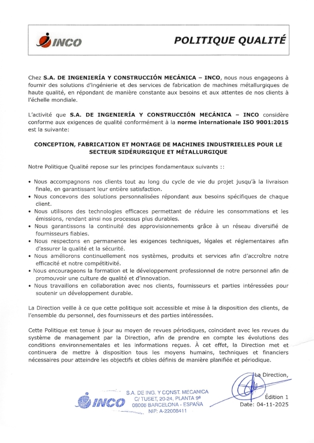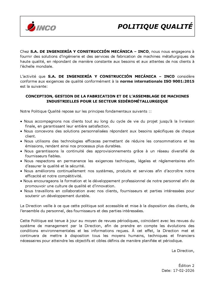 INCO est constitué par un groupe d’entreprises spécialisées en ingénierie et fabrication de équipement et machinerie pour processus métallurgiques tant pour matériaux ferriques que pour matériaux non-ferriques.Nous focalisons notre expérience et capacité professionnelle á améliorer les équipements pour la transformation des produits plats, et augmenter leur valeur ajoutée, en couvrant en plus les processus de fusion et coulée de matériaux non ferriques tels que Aluminium et Cuivre.Notre objectif tout au long des années a été de dessiner des équipements pour satisfaire les nécessites spécifiques de chaque client. En plusieurs occasions cette collaboration entre client et INCO crée processus et machinerie unique au monde, que rendent une grande valeur ajoutée á nos clients et un avantage stratégique dans leurs marches.